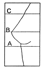 The three common breast measurements: underbust (A), bust (B), chest (C).